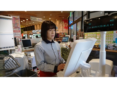 スーパーのレジ登録業務。主に接客やレジでの精算業務を行います。