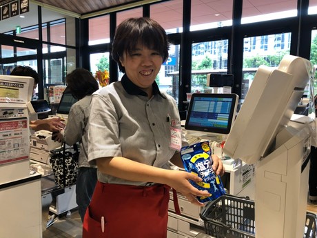 レジの登録業務です。スーパーのレジ業務は接客が大切!